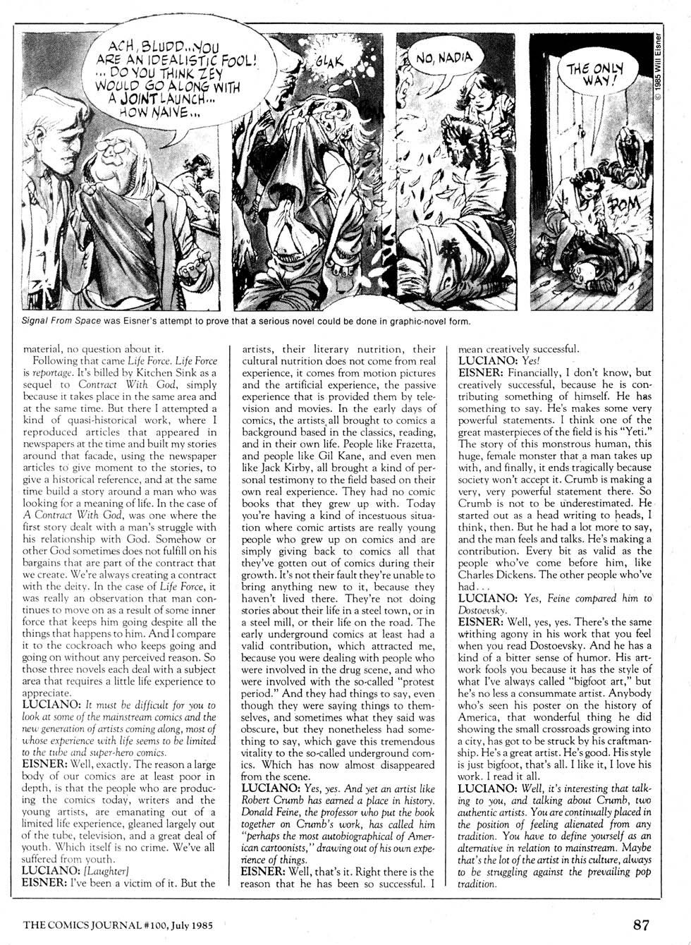 Dale Luciano interviews Eisner in The Comics Journal #100, page 87:
