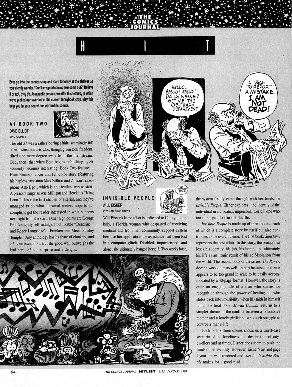 It’s not that these are awful stories — they’re standard, maudlin 30s set pieces, and Eisner does those pretty well — but the damage comes from Eisner trying to shoe-horn the stories into a grander narrative by simply having people mentioning the word “invisible” here and there, and that makes them rather risible.