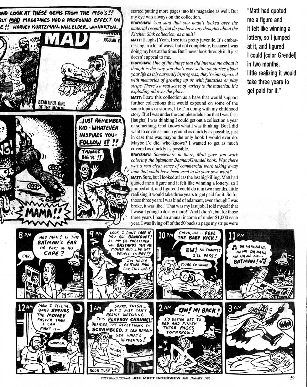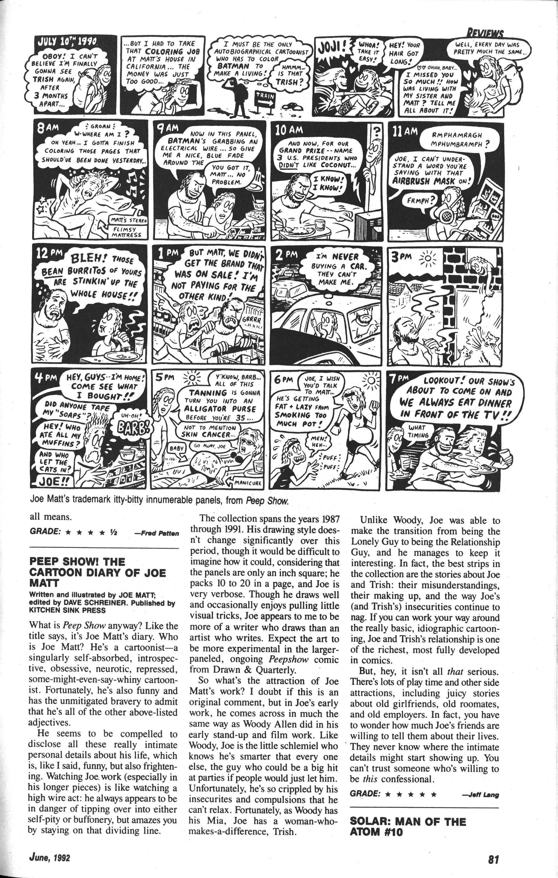 He also tries to go for longer stories — there’s one eight page epic about trying to join Sexaholics Anonymous, but it’s not really a successful move. For one, the subject matter just isn’t that interesting: His strange hang-ups seem pretty trivial, and it seems like So Much Fake Drama. And it also seems over-worked — like he’s tried to make a really, really tidy little story out of it all, and it feels a bit dead. (And it almost feels like Matt did the Sexaholics thing not because he really wanted to, but because he thought it would make a good story.)