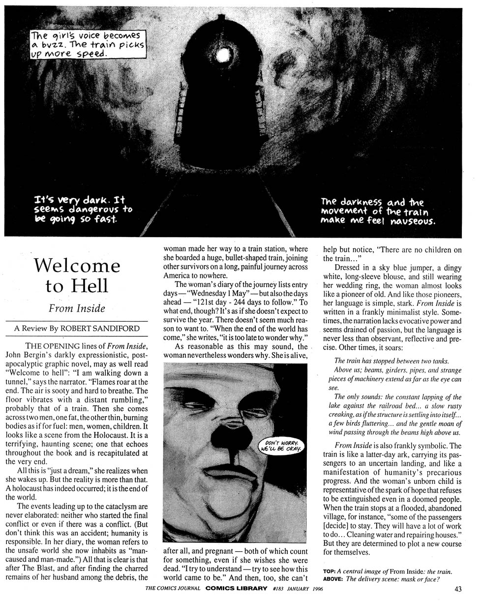 John Bergin is (or was) friends with The Crow creator James O’Barr, and it shows. Though lacking the adolescent revenge fantasy of O’Barr’s chief work (he has chosen instead a pre-natal, post-apocalyptic nightmare), Bergin’s still feels a bit like a comic adaptation of a very long industrial-music video. And that’s not bad.