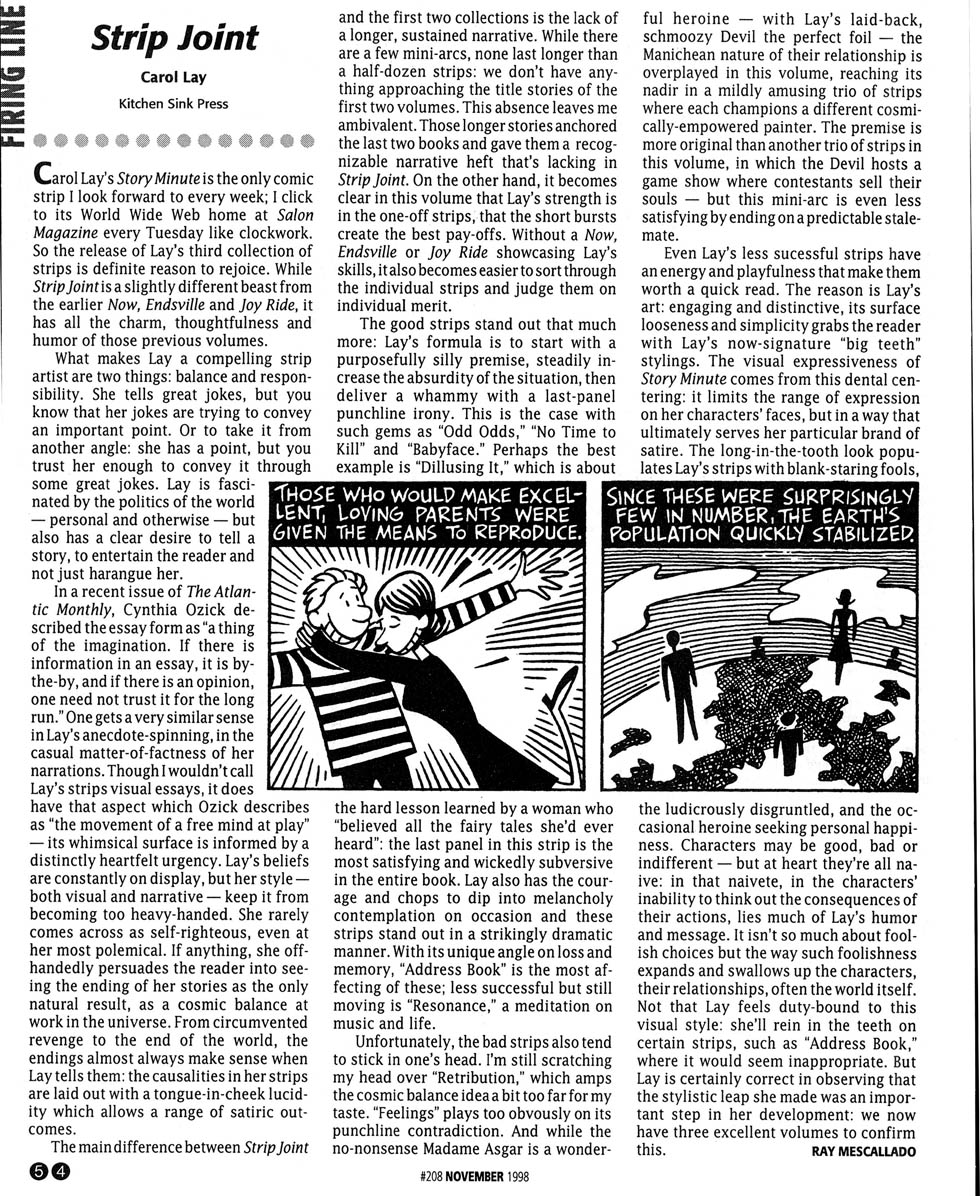 I was a huge fan of Carol Lay’s Good Girls comics back in the 80s, but I was mostly nonplussed by her Story Minutes strip. It’s just me, not the strip — I have zero affinity for fairytales, and I have an active antipathy towards recaps — and a typical Story Minute strip reads like a recap of a fairytale.